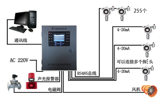 逸云天公司殘留磷化氫檢測報警系統(tǒng)包括氣體檢測探單元、信號傳輸采集單元、顯示單元(報警控制主機(jī)上集中顯示)、監(jiān)控器、控制單元、報警單元、被控設(shè)備單元(如風(fēng)機(jī)、電磁閥)組成。