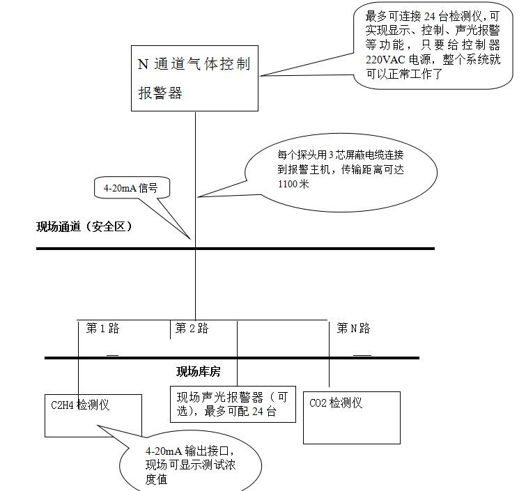 現(xiàn)場(chǎng) C2H4和CO2變送器傳過(guò)來(lái)的4-20mA信號(hào)全部連接到N通道氣體控制報(bào)警器上,當(dāng)某一路C2H4和CO2檢測(cè)儀發(fā)出報(bào)警信號(hào)時(shí)(同時(shí)有繼電器輸出,可觸發(fā)風(fēng)機(jī)或乙醇產(chǎn)生機(jī)開(kāi)關(guān)),提供給監(jiān)控人員分級(jí)的聲光報(bào)警,如果有需要,可以將監(jiān)控主機(jī)通過(guò)網(wǎng)絡(luò)將數(shù)據(jù)傳輸?shù)狡渌O(jiān)控中心。在現(xiàn)場(chǎng)可以實(shí)時(shí)顯示C2H4和CO2的濃度,也可以在每一個(gè)探頭附近裝一個(gè)聲光報(bào)警器,當(dāng)現(xiàn)場(chǎng)發(fā)生報(bào)警時(shí)可以通知人員快速處理或撤離。