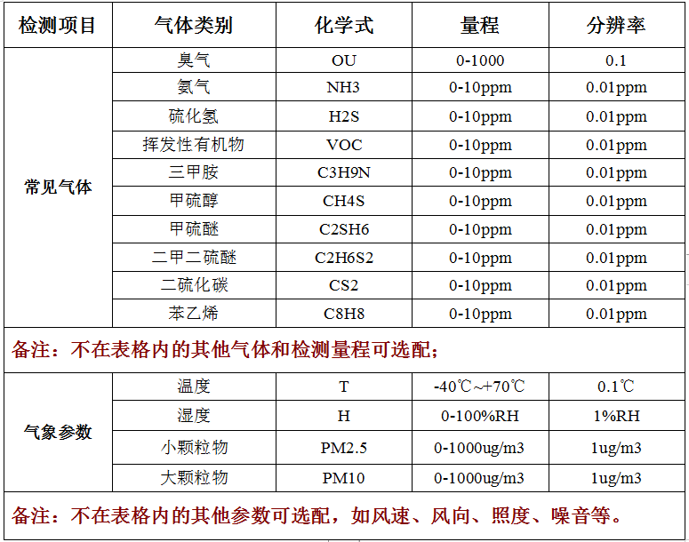 任選氨氣、三甲胺、硫化氫、甲硫醇、甲硫醚、二甲二硫、二硫化碳、苯乙烯、臭氣OU值在內(nèi)的1-9個(gè)指標(biāo),目標(biāo)氣體可進(jìn)行任意組合、檢測(cè)原理不限、檢測(cè)濃度范圍不限,同時(shí)支持選配其他氣體和PM2.5、PM10、溫濕度、風(fēng)速風(fēng)向、大氣壓、噪音、照度等氣象參數(shù)監(jiān)測(cè)。